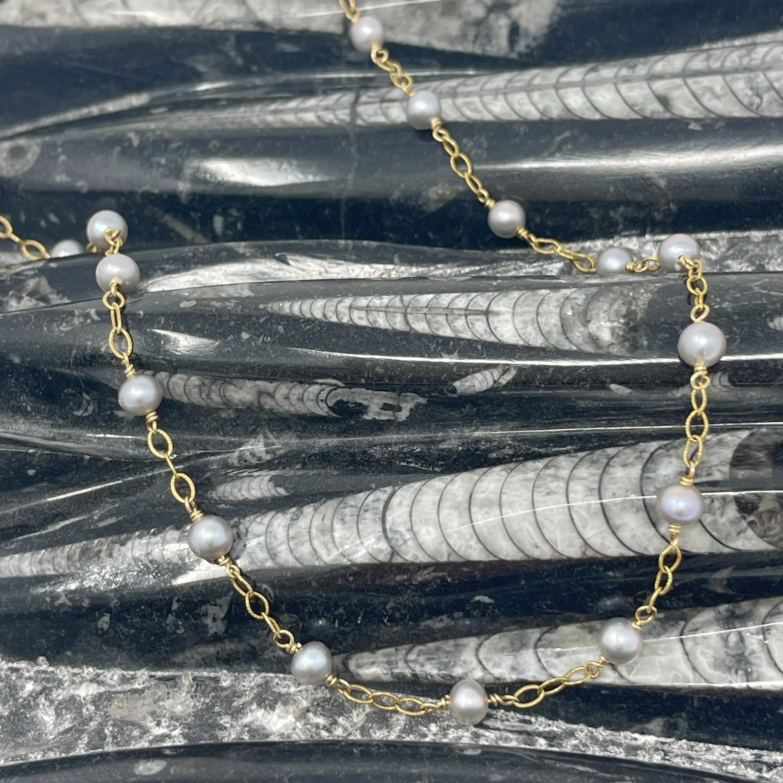 Petite gray freshwater pearls are hand linked to textured 14K gold fill* chain. Perfect for your everyday necklace or to gift someone special. (The gray pearls are irradiated, meaning the dye goes all the way through the pearl.)